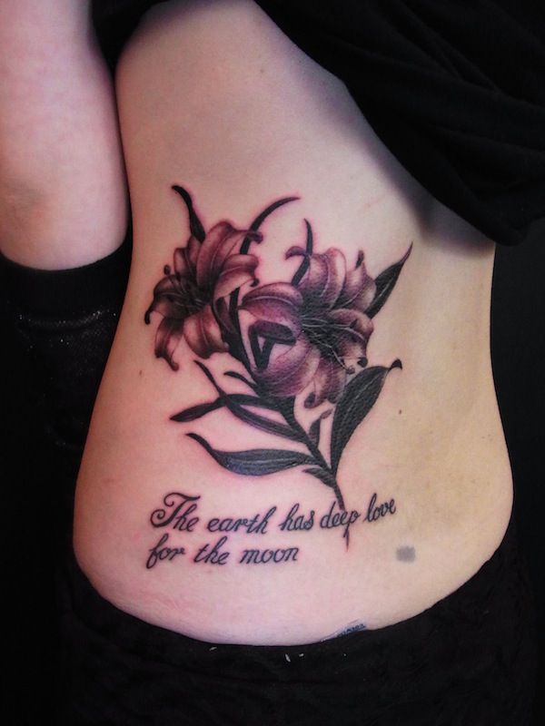 元々あったアザを百合の葉部分で隠す事も含め彫ったものですが、