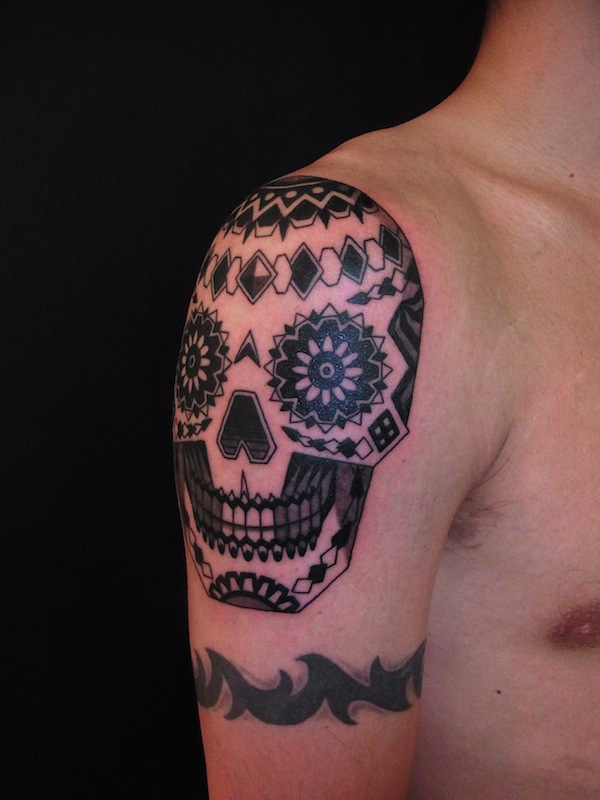 中心を普通に蜘蛛の巣だけで終わらせるのも芸がないかと思い、今回はお任せだったのでスカルが他の部位に入ってたので、クロスボーンで抜いてみました。