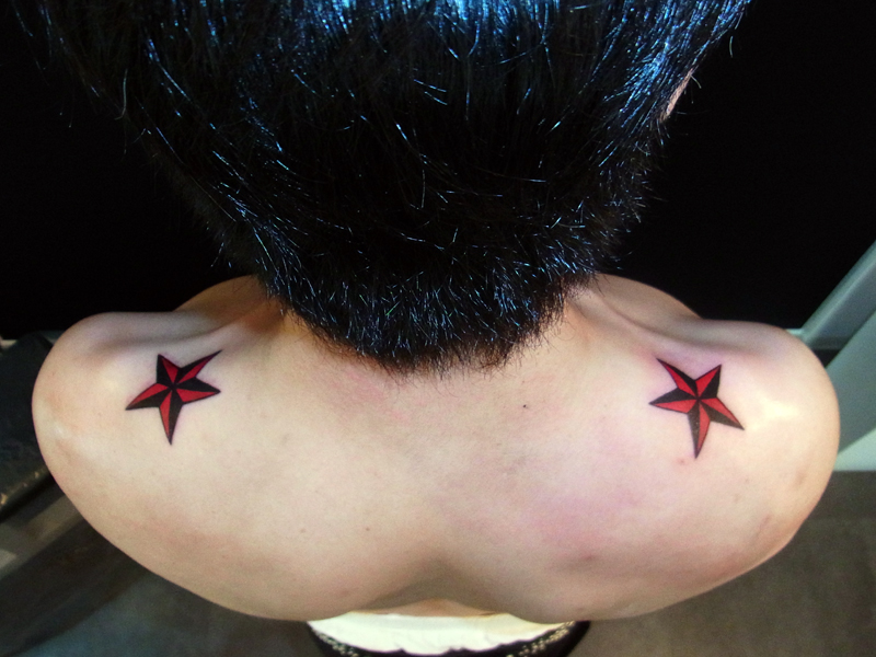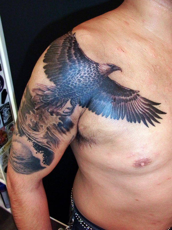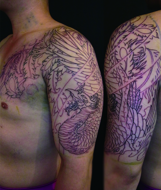 腕側を隠せるように控えめにという事で、肩部分の骨や鎖骨を利用して大きく入るように、なかなかすごい位置と角度で突っ込みました。